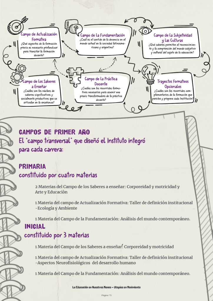 Esto lo implementamos, para Inicial y Primaria, no solamente en primer año, sino de primero a cuarto, el trabajo por campos, con una mirada que intentaba articular las materias dentro del campo –que no fue sencillo y no en todos lados salió bien-, tomando el campo de la práctica docente por un lado, donde lxs profes trabajaban en una articulación más horizontal, todxs lxs profes del campo de la práctica juntos, con todxs lxs chicxs de ese año, el campo de la formación general, con las materias que marca el diseño que están dentro del campo de la formación general, lo mismo con las específicas, y luego nos quedaban algunas materias en las que pensamos que era conveniente constituir otra articulación.