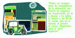 Hubo un compromiso de trabajadorxs de la educación tan fuerte en asegurar las trayectorias, en ir a buscar a los pibes al barrio, a las 9 de la noche, a las 10 de la noche, que en la escuela se generó el turno vespertino para el ciclo superior; porque como aumentó nuestra matrícula en el ciclo superior, y como somos una escuela de edificio compartido con una primaria, no podíamos hacerlo ni en el mismo turno mañana ni en el turno tarde porque funciona la primaria. Entonces generamos el turno vespertino, además porque los chicos ya habían empezado con algún tipo de inclusión laboral.